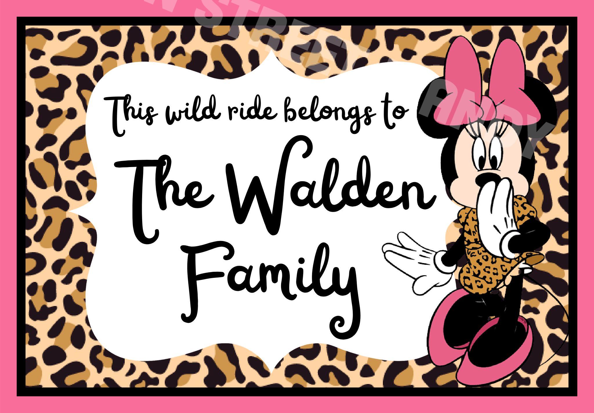 Headed to Disney? This stroller tag is perfect for your upcoming trip! Great for those times where you park your stroller for rides, shows & parades - you can easily spot your stroller amongst the hundreds of other strollers! (This is especially helpful since cast members are always moving strollers around! Save yourself some time and stress by easily identifying what is yours! This sign features Minnie Mouse in Leopard with a leopard background!