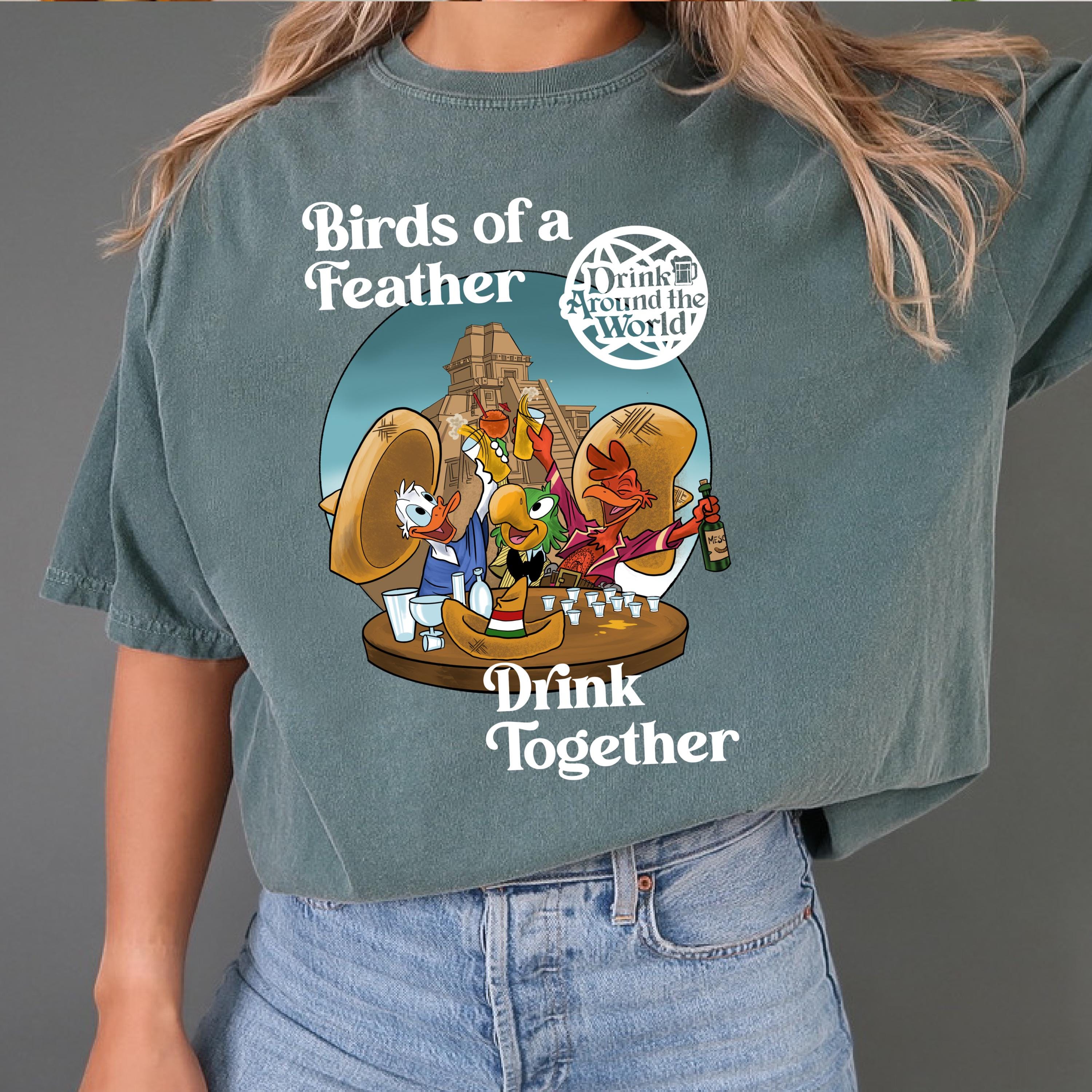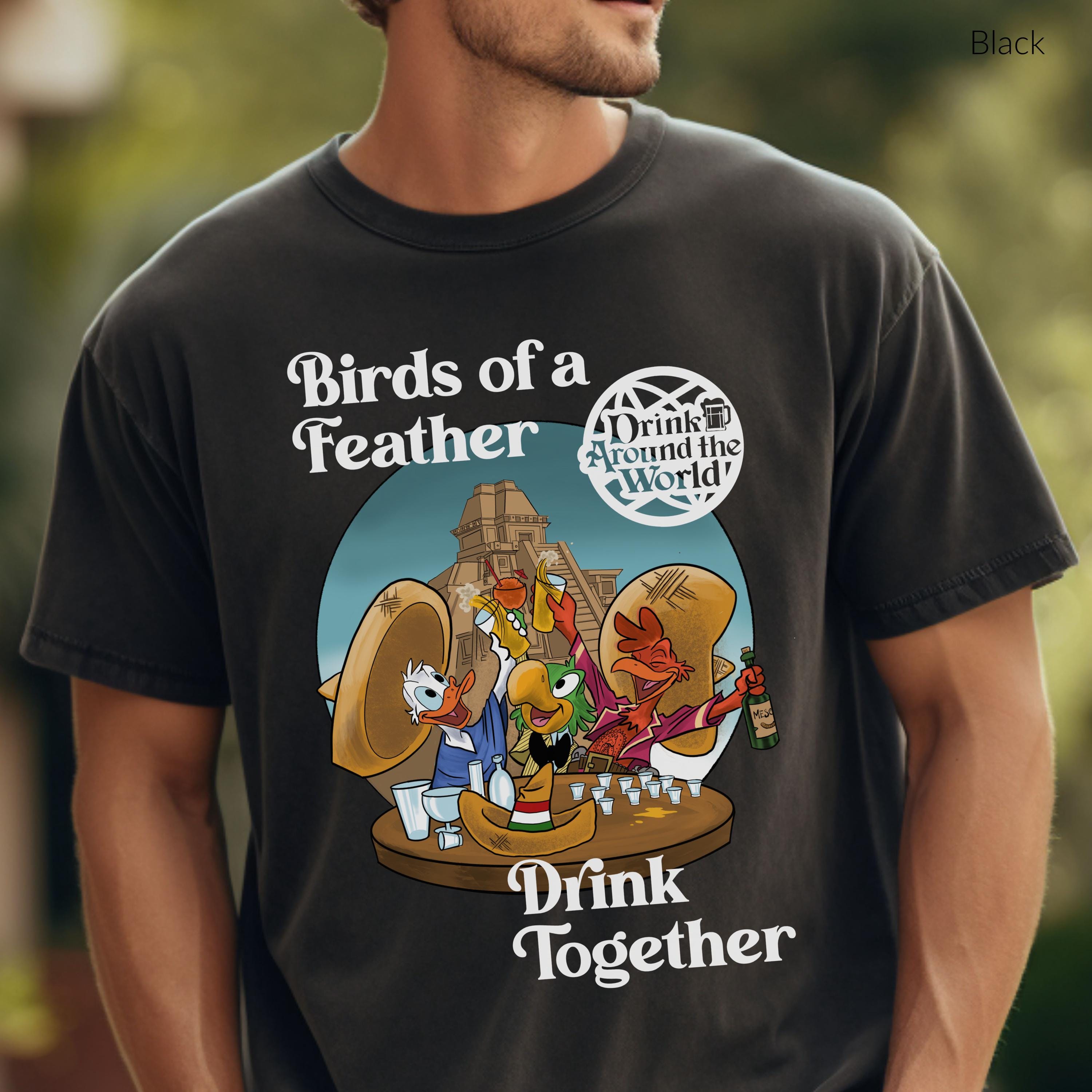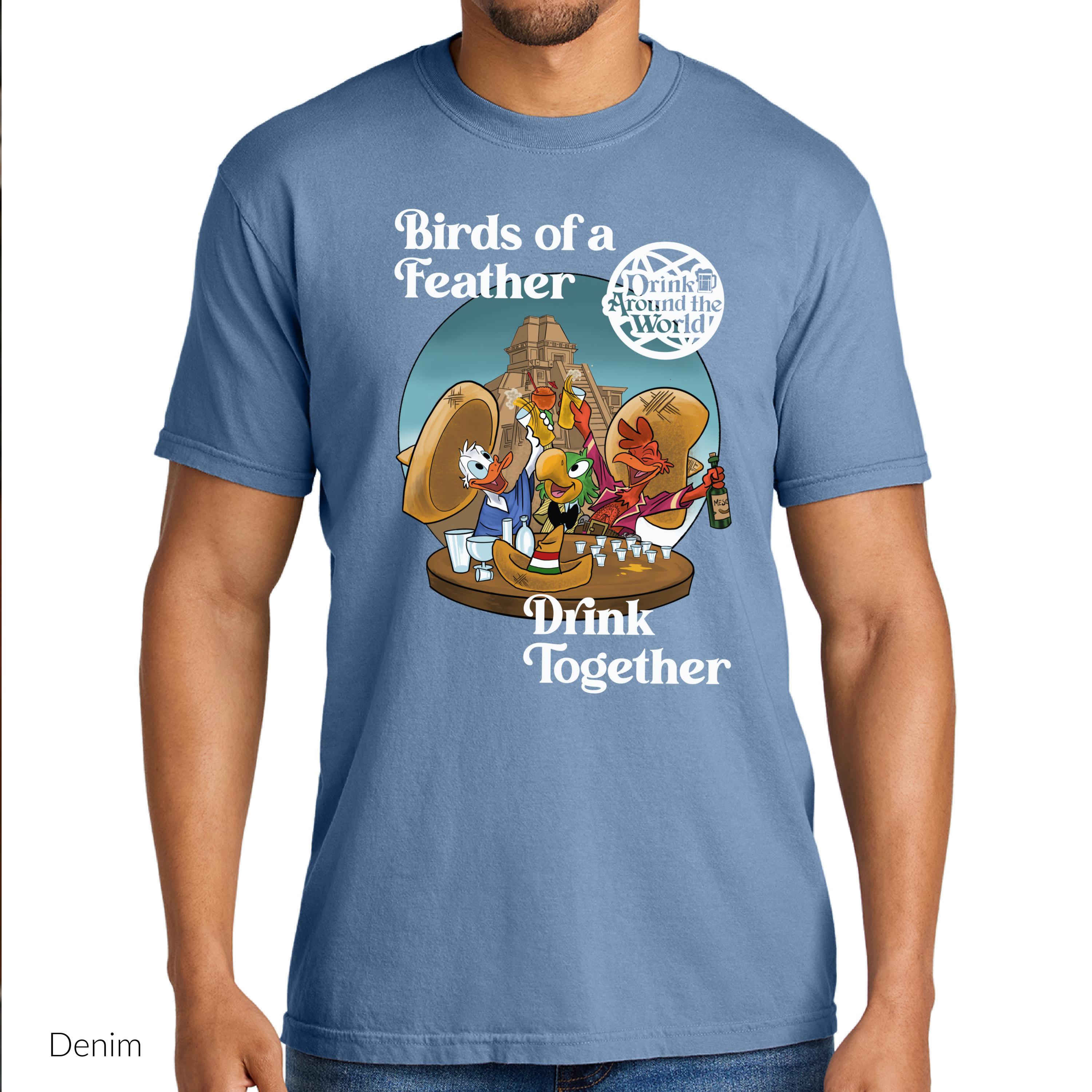 Step into Disney nostalgia with this "Birds of a Feather Drink Together" tee featuring The Three Caballeros in the EPCOT's Mexico Pavilion. The perfect tee for park days, resort stays, everyday wear and drinking around the world!