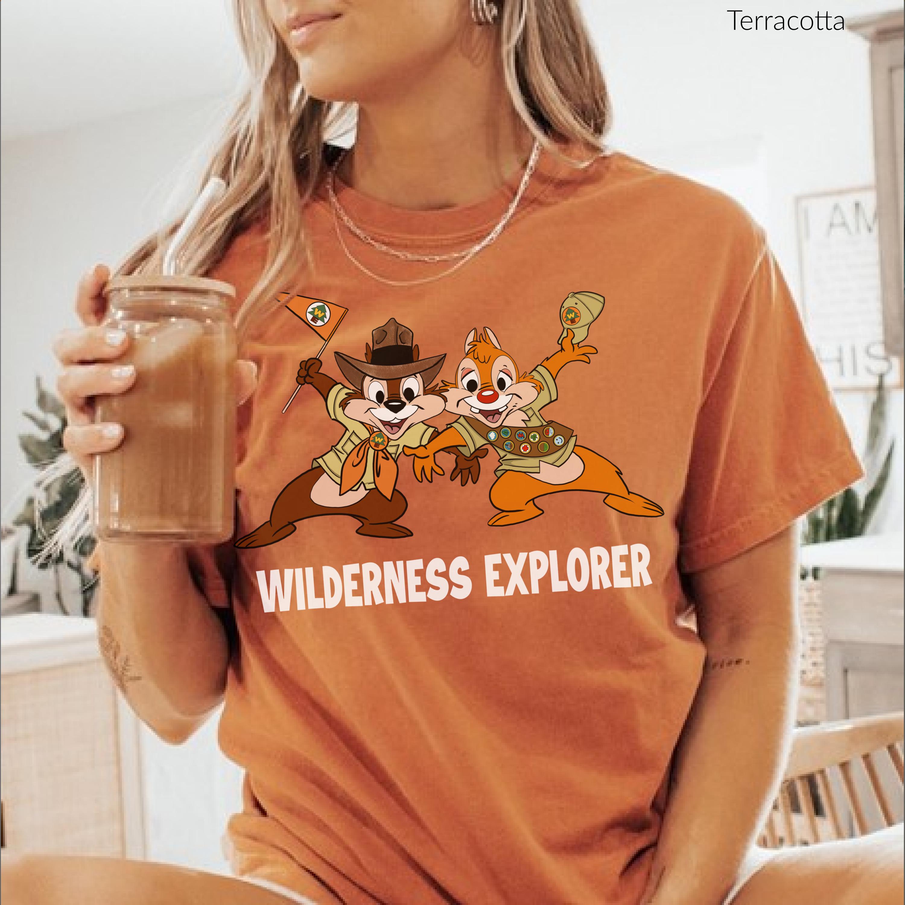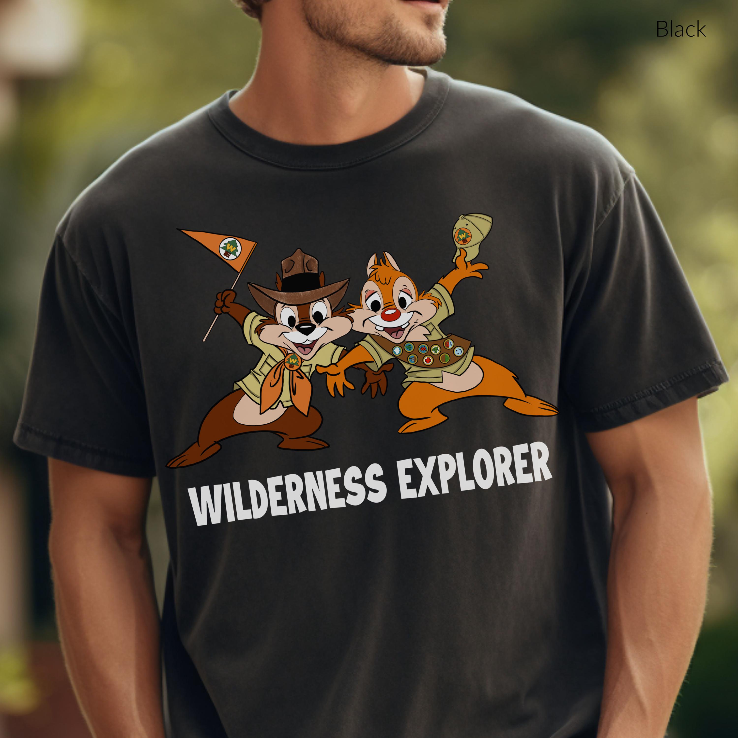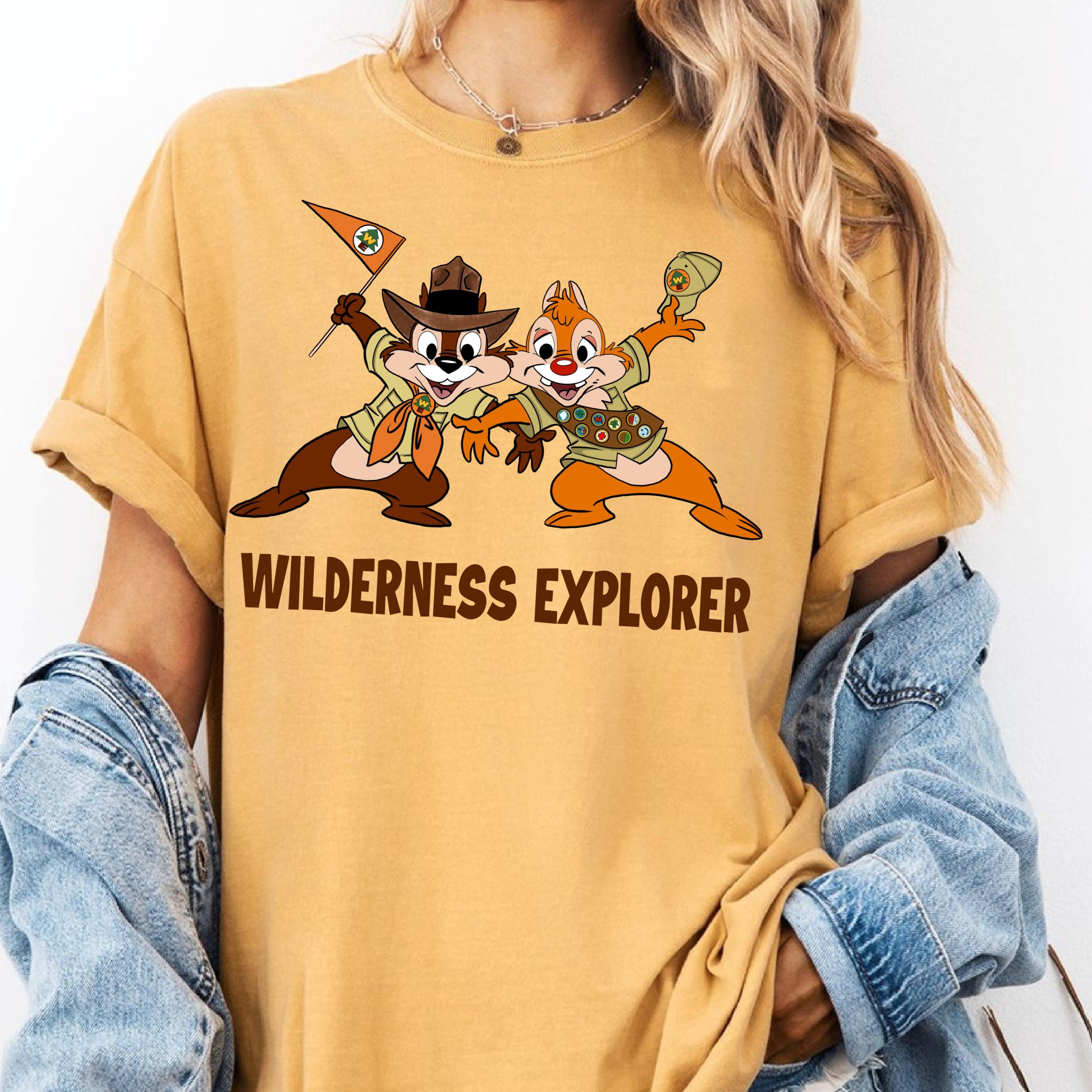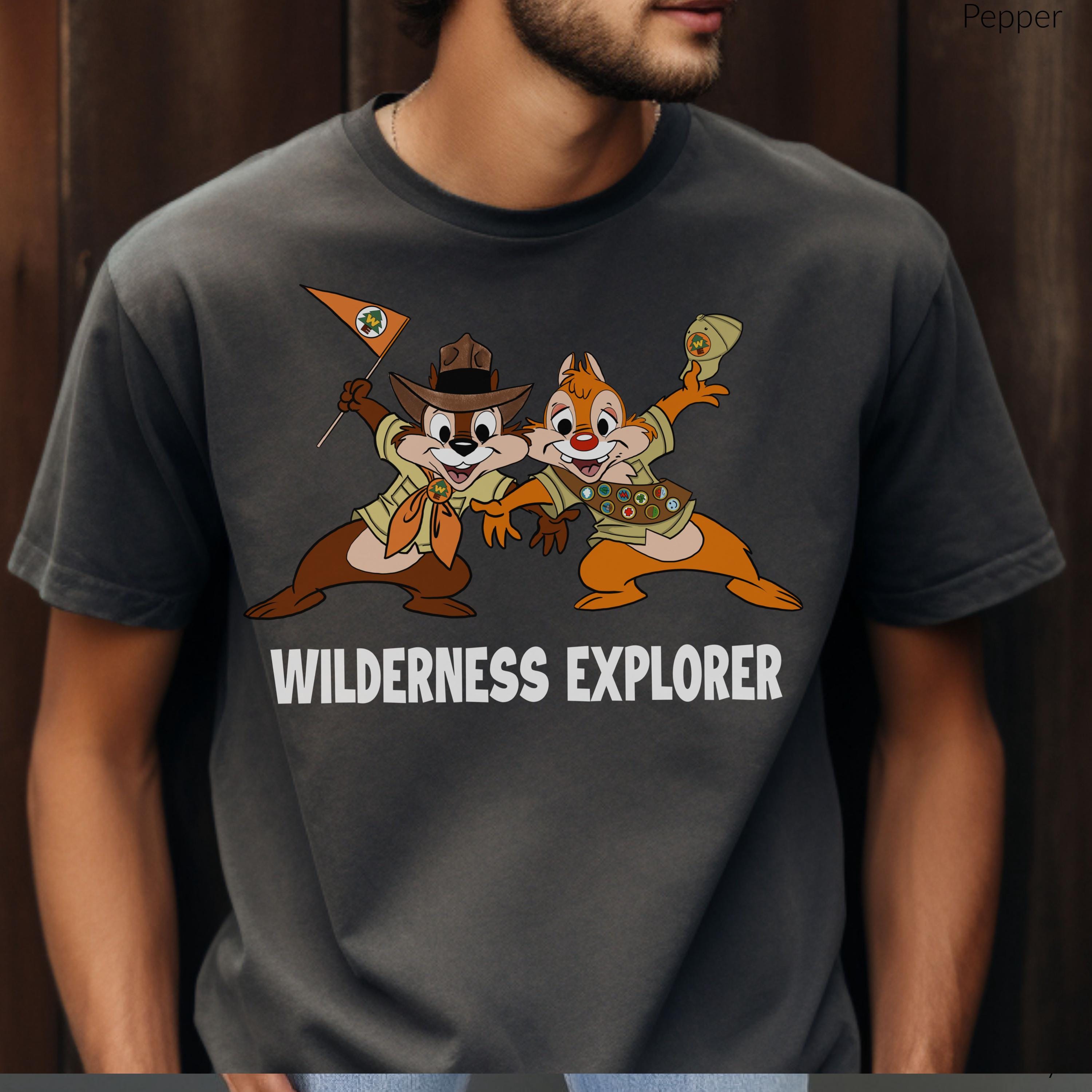 Step into Disney nostalgia with this Chip and Dale tee. The dynamic duo is dressed in their "Up" best as wilderness explorers! This shirt is perfect for a day at animal kingdom or everyday wear!