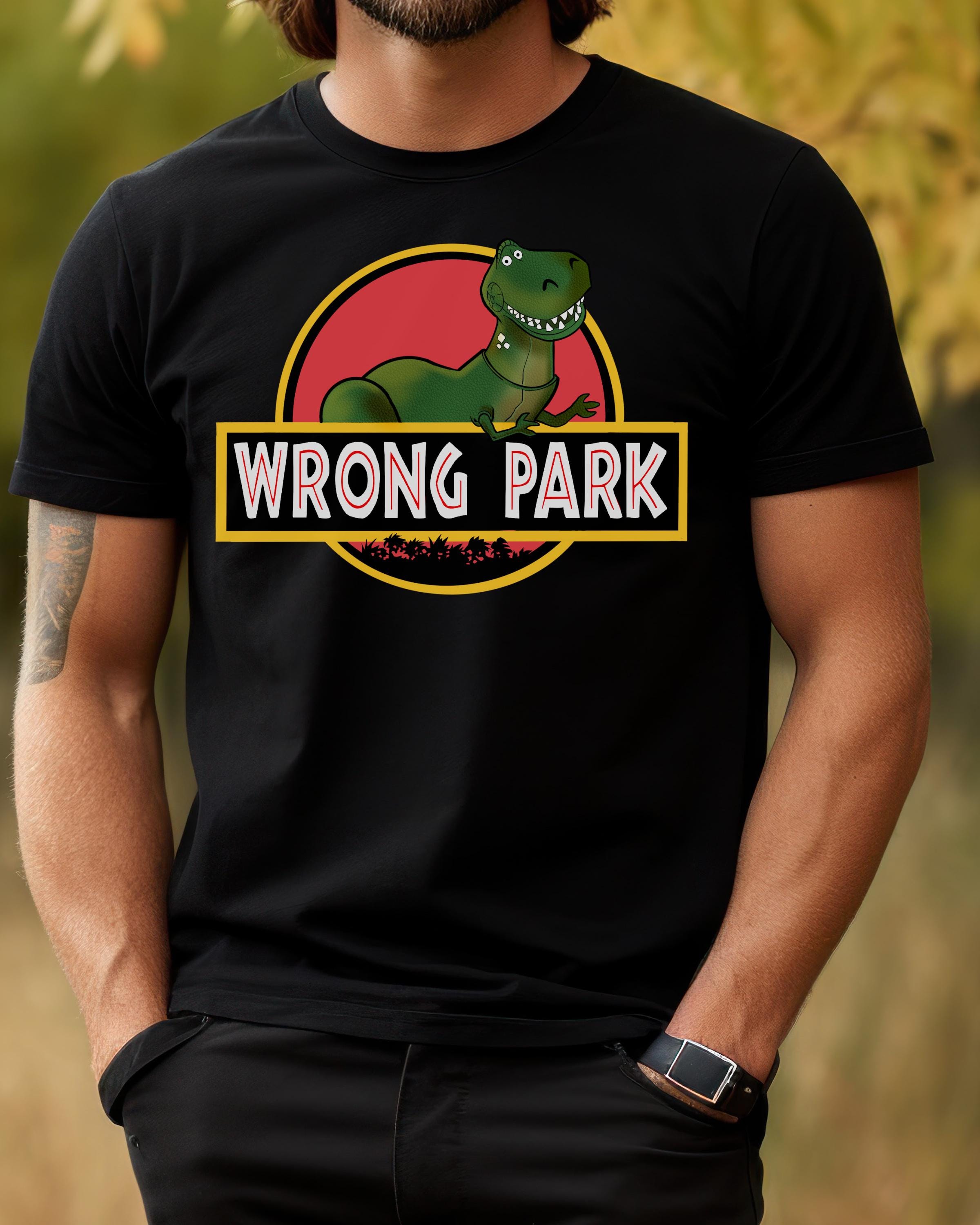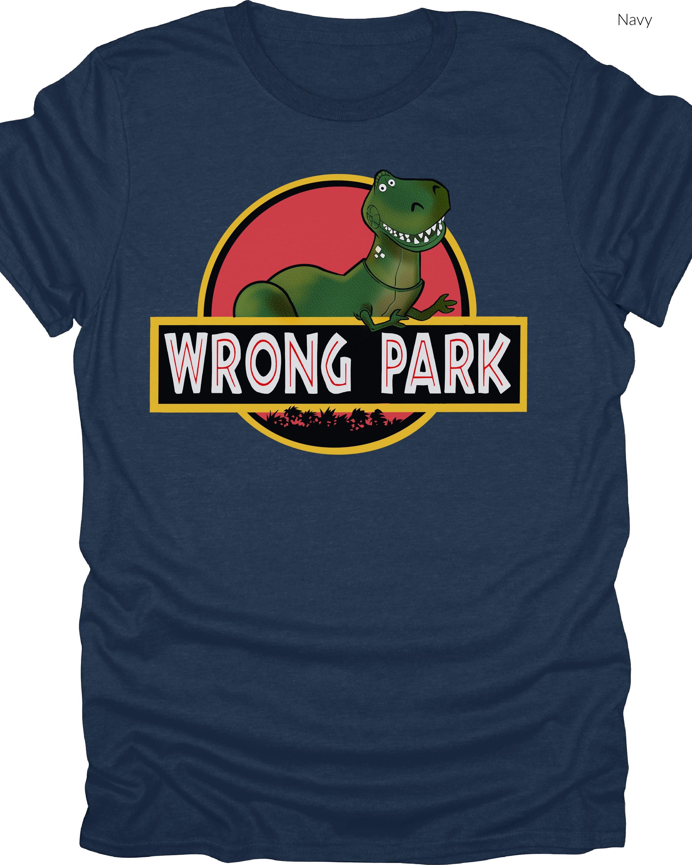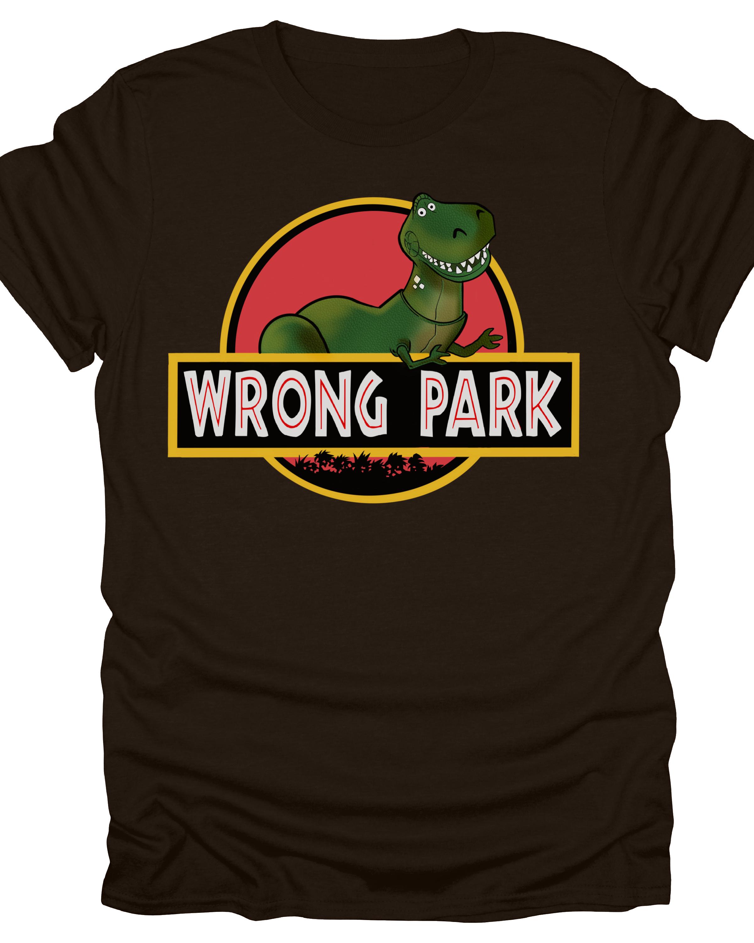 Custom Fan Art Tee - "Wrong Park"  features Rex from Toy Story inside the logo of Jurassic Park
