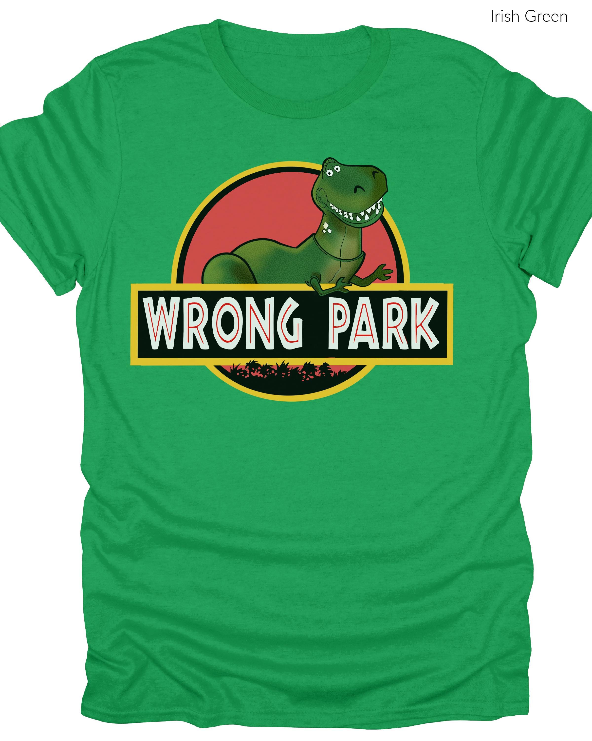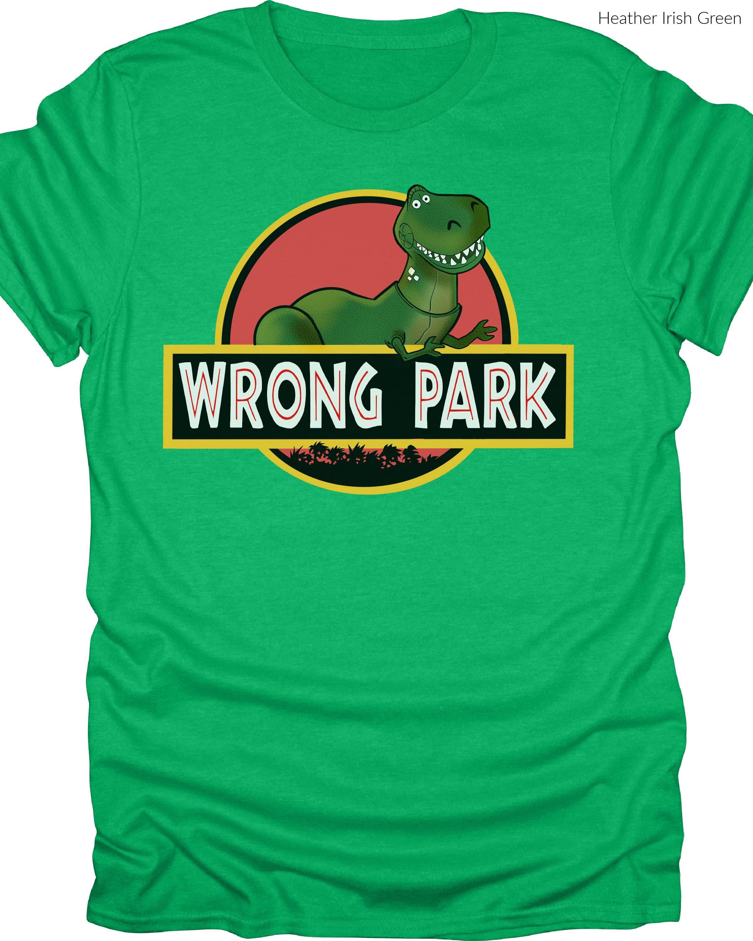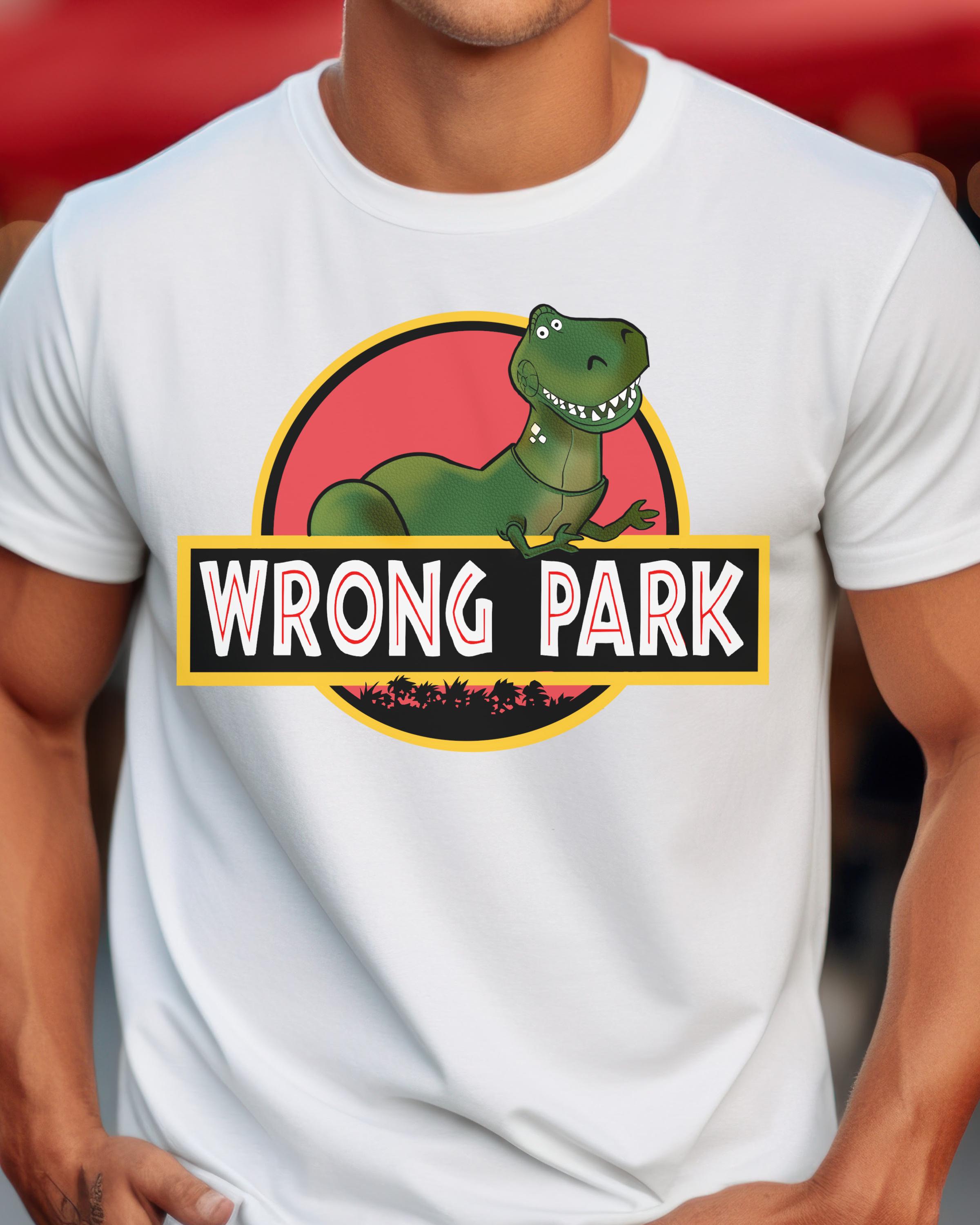 Custom Fan Art Tee - "Wrong Park"  features Rex from Toy Story inside the logo of Jurassic Park