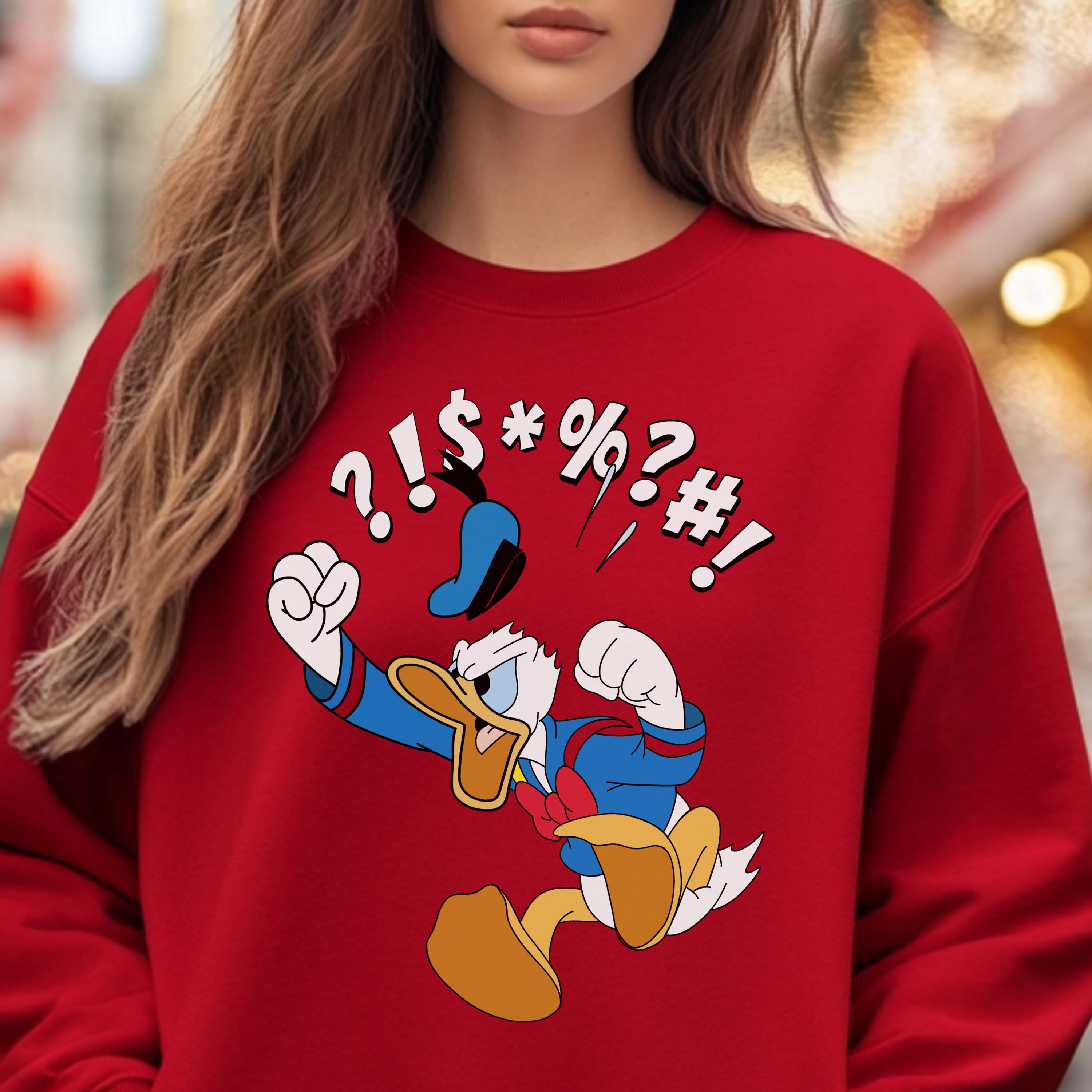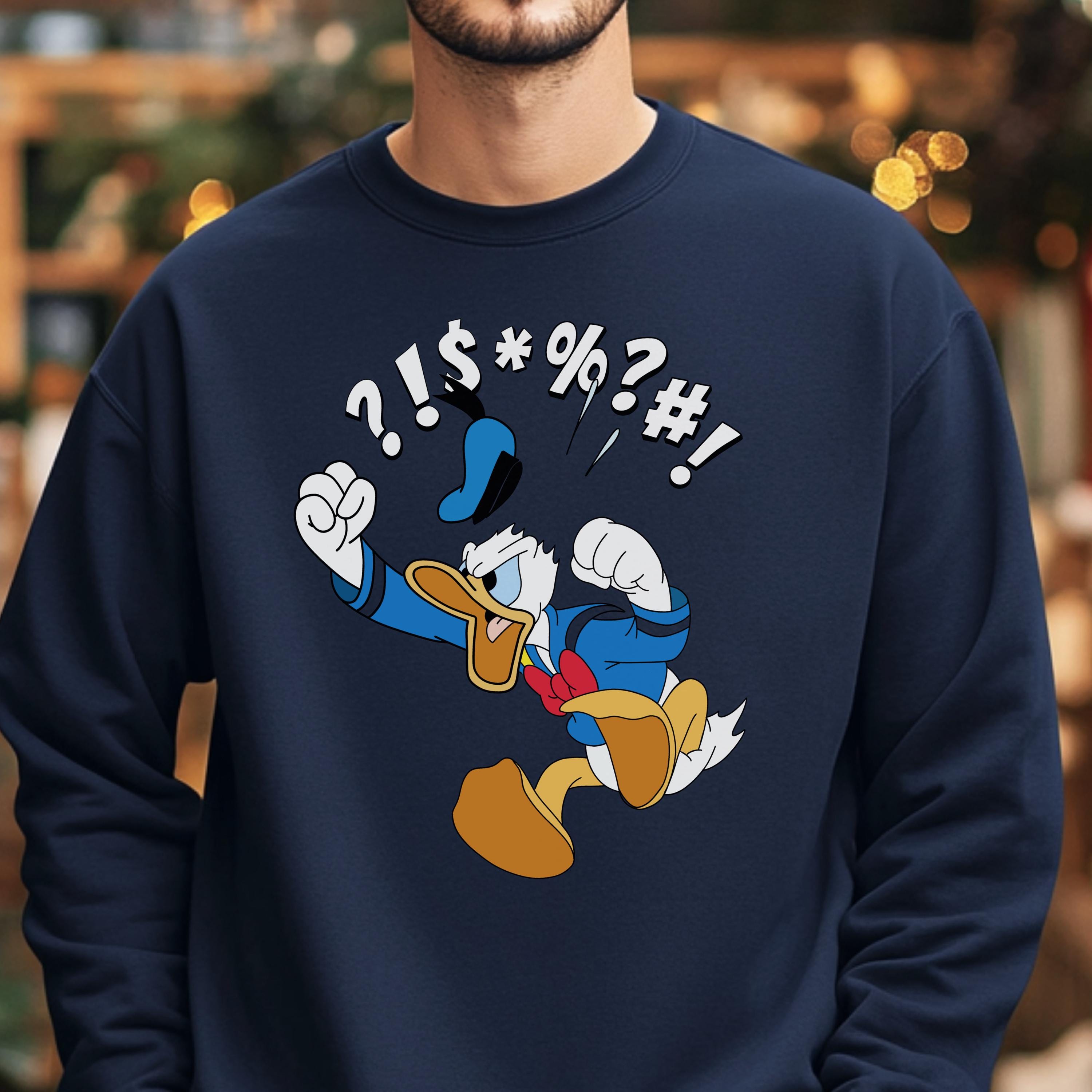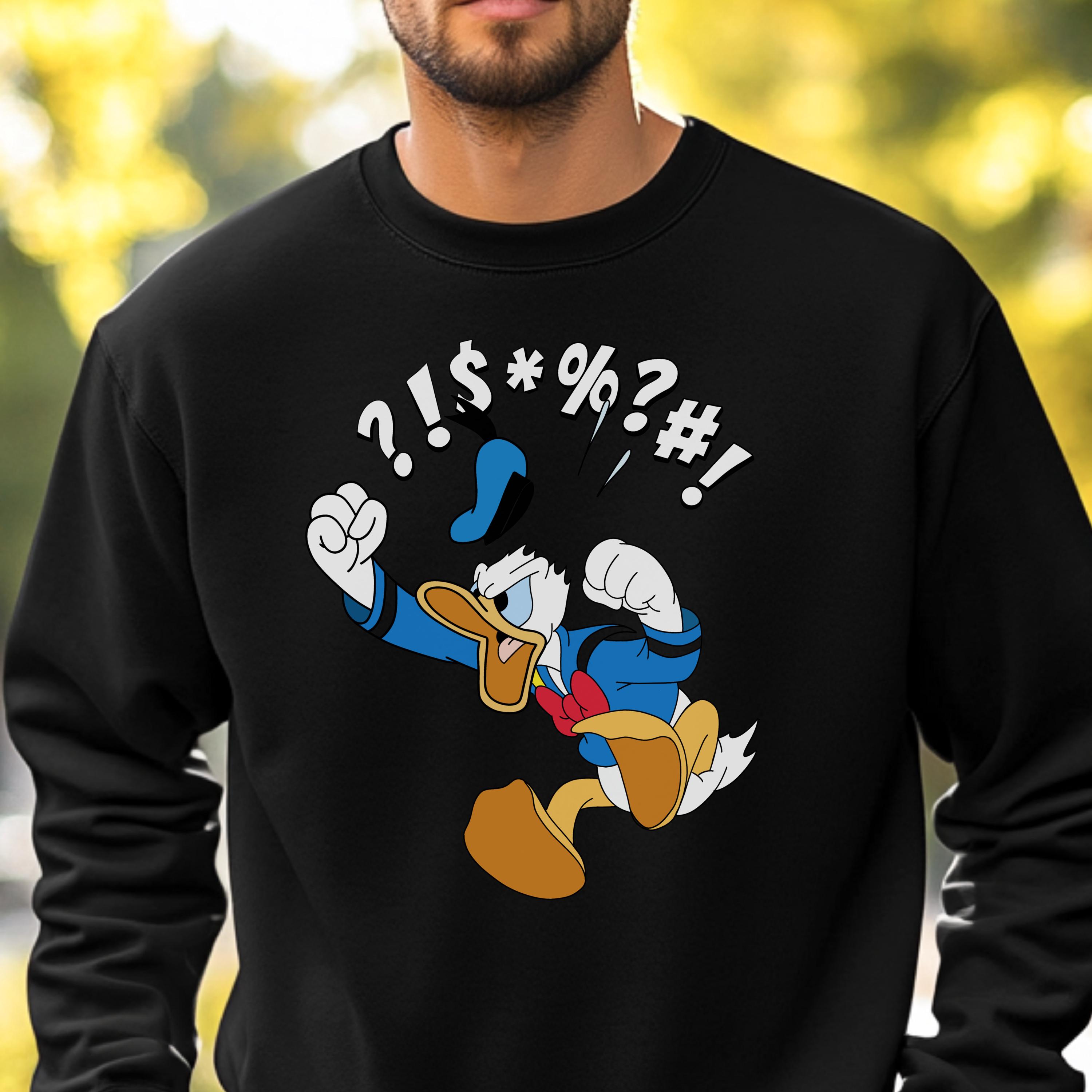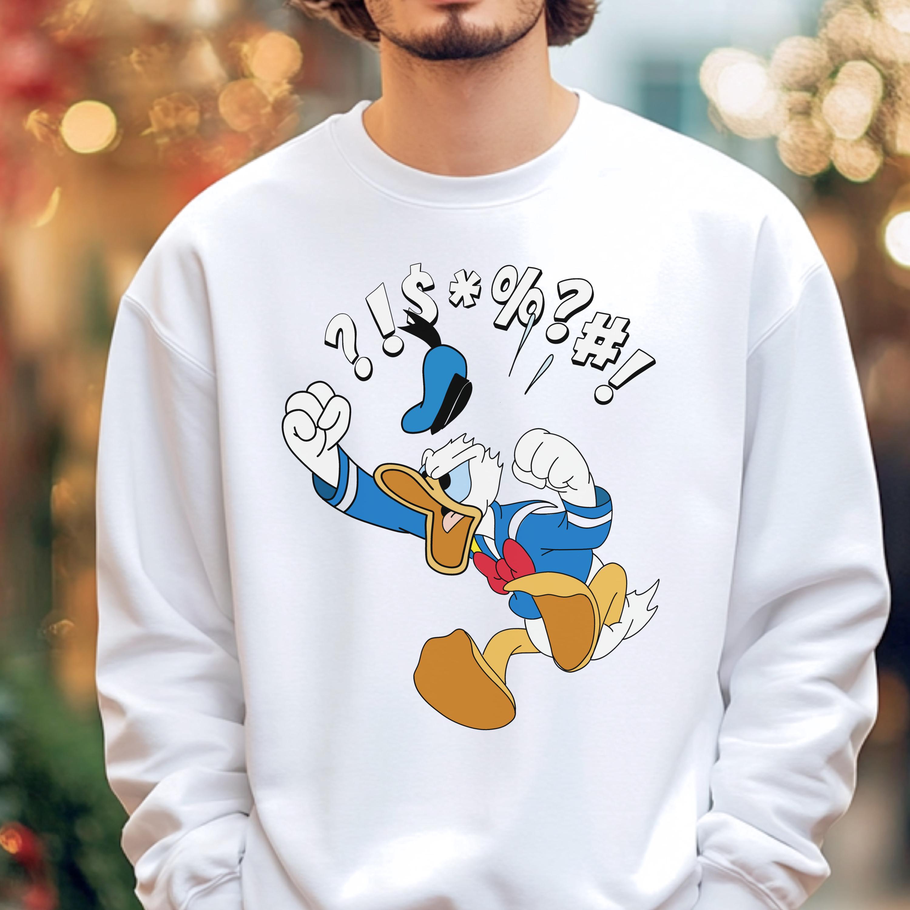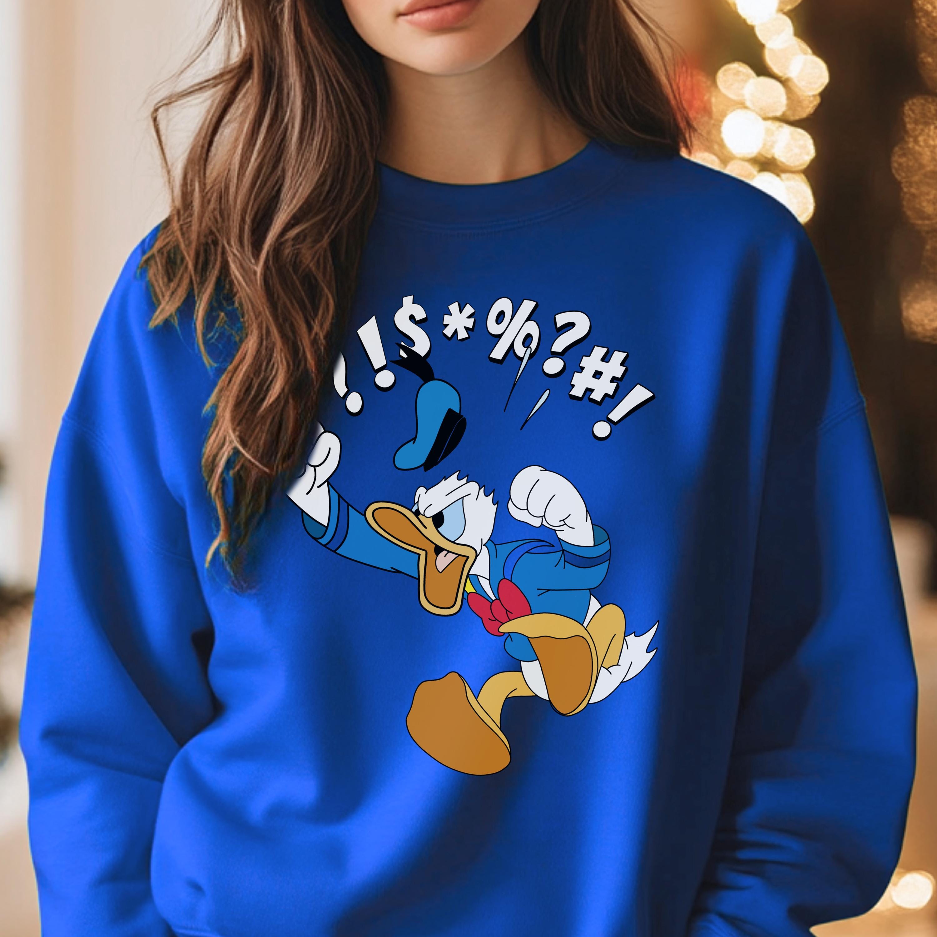 Featuring the iconic duck mid-tantrum with comic style symbols like "?!$&%#" - this cozy crewneck perfectly captures Donald's timeless charm and fiery personality!